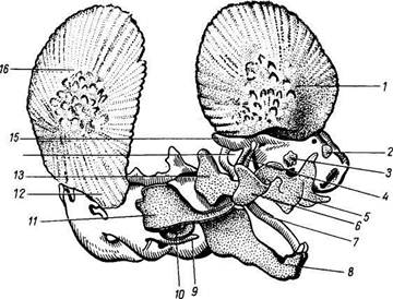 Рис. 8. Череп эмбриона человека, 3-й месяц развития. / — os frontale; 2 — os na-sale; 3 — os lacrimale; 4 — os pterygoideum; 5 — maxilla; 6 — os zygomaticum; 7 — cartilago ventralis; 8 — mandibula; 9 - processus styloideus; 10 - os tympa-nicum; 11 — squama tem-poralis; 12, 16 — os parie-tale; 13 — ala major; 14 — canalis opticus; 15 — ala minor. кости могут развиваться на почве соединительной или хрящевой ткани, поэтому различаются следующие виды окостенения (остеогенеза). 1. Эндесмальное окостенение (en — внутри, desme — связка) происходит в На определенном участке эмбриональной соединительной ткани, имеющей очертания будущей кости, благодаря деятельности остеобластов появляются островки костного вещества (точка окостенения). Из первичного центра процесс окостенения распространяется во все стороны лучеобразно путем наложения (аппозиции) костного вещества по периферии. Поверхностные слои соединительной ткани, из которой формируется покровная кость, остаются в виде надкостницы, со стороны которой происходит увеличение кости в толщину. 2. Перихондралъное окостенение (peri — вокруг, chondros — хрящ) проис Мезенхимный зачаток, имеющий очертания будущей кости, превращается в «кость», состоящую из хрящевой ткани и представляющую собой как бы хрящевую модель кости. Благодаря деятельности остеобластов надхрящницы, покрывающей хрящ снаружи, на поверхности его, непосредственно под надхрящницей, откладывается костная ткань, которая постепенно замещает ткань хрящевую и образует компактное костное вещество. 3. С переходом хрящевой модели кости в костную надхрящница 4. Эндохондральное окостенение (endo, греч. — внутри, chondros — хрящ) эндохондрального окостенения из центра к периферии приводит к формированию губчатого костного вещества. Происходит не прямое превращение хряща в кость, а его разрушение и замещение новой тканью, костной. Характер и порядок окостенения функционально обусловлены также приспособлением организма к окружающей среде. Так, у водных позвоночных (например, костистых рыб) окостеневает путем перихондрального остеогенеза только средняя часть кости, которая, как во всяком рычаге, испытывает большую нагрузку (первичные ядра окостенения). То же наблюдается и у земноводных, у которых, однако, средняя часть кости окостеневает на большем пространстве, чем у рыб. С окончательным переходом на сушу к скелету предъявляются большие функциональные требования, связанные с более трудным, чем в воде, передвижением тела по земле и большей нагрузкой на кости. Поэтому у наземных позвоночных появляются вторичные точки окостенения, из которых у пресмыкающихся и птиц путем эндохондрального остеогенеза окостеневают и периферические отделы костей. У млекопитающих концы костей, участвующие в сочленениях, получают даже самостоятельные точки окостенения. Такой порядок сохраняется и в онтогенезе человека, у которого окостенение также функционально обусловлено и начинается с наиболее нагружаемых центральных участков костей. Так, сначала на 2-м месяце утробной жизни возникают первичные точки, из которых развиваются основные части костей, несущие на себе наибольшую нагрузку, т. е. тела, или диафизы, diaphysis, трубчатых костей (dia, греч.—между, phyo — расту; часть кости, растущая между эпифизами) и концы диафиза, называемые метафизами, metaphysis (meta — позади, после). Они окостеневают путем пери- и эндохондрального остеогенеза. Затем незадолго до рождения или в первые год