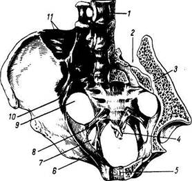 Рис. 51. Связки и суставы таза; вид сверху. Горизонтальный и сагиттальный распилы через середину левой тазовой кости, крестец и III — V поясничные позвонки. 1 — lig. longitudinale anterius; 2 — ligg. sacroiliaca interossea; 3 - articulatio sacroiliaca; 4 — lig. sacrococygeum ventrale; 5 - symphysis pu-bica; 6 — lig. sacrotuberale; 7 — for. ischiadicum minus; 8 — lig. sacrospinale; 9 — for. ischiadicum majus; 10 — ligg. sacroiliaca ventralia; 11 - lig. iliolumbale. ного сочленения. Последнее укрепляется еще и другими связками, соединяющими крестец и подвздошную кость: спереди — ligg. sacroiliaca ventra-lia, сзади — ligg. sacroiliaca dorsalia, а также lig. iliolumbale, которая протянута от поперечного отростка V поясничного позвонка к crista iliaca. Крестцово-подвздошное сочленение васкуляризуется из аа. lumbalis, iliolumbalis et sacrales laterales. Отток венозной крови происходит в одноименные вены. Отток лимфы осуществляется по глубоким лимфатическим сосудам в nodi lymphatici sacriles et lumbales. Иннервация сустава обеспечивается ветвями поясничного и крестцового сплетений. 2. Лобковый симфиз, symphj/sis piibica, соединяет, располагаясь по средней линии, обе лобковые кости между собой. Между обращенными друг к другу fades symphysialis этих костей, покрытыми слоем гиалинового хряща, заложена волокнисто-хрящевая пластинка, discus interpubicus, в которой обычно, начиная с 7-летнего возраста, находится узкая синовиальная щель (полусустав). Лобковый симфиз подкреплен плотной надкостницей и связками; на верхнем крае — lig. pubicum superius и на нижнем — lig. arcuatum pubis; последняя сглаживает под симфизом угол, angulus subpubicus. 3. Lig. sacrotuberale и lig. sacrospinale (рис. 51)x — две крепкие межкостные связки, соединяющие на каждой стороне крестец с тазовой костью: первая — с tuber ischii, вторая — со spi'na ischiadica. Описанные связки дополняют костный остов таза в задненижнем его отделе и превращают большую и малую седалищные вырезки в одноименные отверстия: foramen ischiadicum majus et mfnus. 4. Запирательная мембрана, membrana obturatoria, — фиброзная пластинка, закрывающая собой foramen obturatum таза, за исключением верхнелатерального угла этого отверстия. Прикрепляясь к краям находящегося здесь sulcus obturatorius лобковой кости, она превращает этот желобок в одноименный канал, canalis obturatorius, обусловленный прохождением запирательных сосудов и нерва.