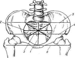Рис. 52. Линии, по которым определяют размер женского таза. 1 — diameter recta (conjugata anatomica); 2 — diameter transversa; 3 — diameter ob- Таз как целое Обе тазовые кости, соединяясь друг с другом и с крестцом, образуют костное кольцо таз, pelvis, которое служит для соединения туловища со свободными нижними конечностями. Костное кольцо таза разделяется на два отдела: верхний, более широкий — большой таз, pelvis major, и нижний, более узкий — малый таз, pelvis minor. Большой таз ограничен только с боков более или менее сильно развернутыми подвздошными костями. Спереди он не имеет костных стенок, а сзади ограничен поясничными позвонками. Верхнюю границу малого таза, отделяющую его от большого, составляет по г рани чная линия, linea terminalis, образованная мысом promontrorium, lineae arcuatae подвздошных костей, гребнями лобковых костей и верхним краем лобкового симфиза. Ограниченное таким образом отверстие носит название apertura pelvis superior. Книзу от входа лежит полость малого таза, cdvum pelvis. Спереди стенка тазовой полости, образованная лобковыми костями и их соединением между собой, очень коротка. Сзади стенка, наоборот, длинная и состоит из крестца и копчика. По бокам стенки малого таза образованы участками тазовых костей, соответствующими вертлужным впадинам, а также седалищными костями вместе с идущими к ним от крестца связками. Внизу тазовая полость оканчивается нижней апертурой таза, apertura pelvis inferior, ограниченной ветвями лобковых и седалищных костей, седалищными буграми, со связками, идущими от крестца к седалищным костям, и, наконец, копчиком. Измерения таза акушерами производятся с помощью циркуля. При измерении большого таза определяют три поперечных размера (рис. 52): 1. Расстояние между двумя spina iliaca anterior superior — distantia 2. Расстояние между двумя crista iliaca — distantia cristarum, равное 3. Расстояние между двумя trochanter major — distantia trochanterica, Затем определяют наружный прямой размер: 4. Расстояние от симфиза до углубления между последним поясничным