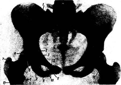Рис. 54. Рентгенограмма таза и тазобедренного сустава женщины. 1 - крестцово-подвздошный сустав; 2 — полость тазобедренного сустава; 3 - передний контур вертлуж-ной впадины; 4 — задний контур вертлужной впадины; 5 — головка бедра; 6, 7 — малый и большой веотелы соответственно; 8 — седалищный бугор; 9 — тело седалищной кости; 10 — ветвь седалищной кости; 11 — нижняя ветвь лобковой кости; 12 — верхняя ветвь лобковой кости; 13 — бедро; 14 — шейка бедра. вследствие чего фигура входа в малый таз напоминает карточное сердце. Наконец, у человека, обладающего прямохождением, таз стал короче и шире, так что у мужчин оба размера становятся почти одинаковыми, а у женщин, у которых он приобретает особую функцию в связи с вынашиванием плода и актом родов, поперечный размер даже преобладает над передне-задним. У неандертальцев таз обладает всеми человеческими признаками, что свидетельствует о вертикальном положении тела и двуногом хождении, но он еще несколько уже, чем у современного человека. Отражая этот процесс эволюции, и в онтогенезе человека таз сначала (у плодов) имеет узкую форму, свойственную четвероногим, затем, у новорожденного, он похож на таз антропоидов (обезьяний таз) и, наконец, по мере усвоения способности прямохождения постепенно приобретает характерную для человека форму. В период наступления полового созревания особенно резко начинают проявляться половые различия, которые выражаются в следующем. Кости женского таза в общем тоньше и более гладки, чем у мужчин. Крылья подвздошных костей у женщин более развернуты в стороны, вследствие чего расстояние между остями и гребнями больше, чем у мужчин. Вход в женский таз имеет поперечно-овальную форму, тогда как форма входа мужского таза скорее продольно-овальная. Мыс мужского таза более выдается вперед, чем мыс женского таза. Мужской крестец относительно узок и более сильно вогнут, женский же, наоборот, относительно шире и вместе с тем более плоский. Тазовый вход у мужчин значительно уже, чем у женщин; у последних седалищные бугры отстоят дальше друг от друга и копчик меньше выдается вперед. Место схождения нижних ветвей лобковых костей на хорошо развитом женском тазе имеет форму дуги, arcus pubis, тогда как на мужском тазе оно образует острый угол, angulus subpubicus. Полость малого таза у мужчин имеет ясно выраженную воронкообразную форму, у женщин эта воронкообразность менее заметна и их тазовая полость по своим очертаниям приближается к цилиндру. Резюмируя все сказанное относительно половых отличий таза, можно сказать, что вообще мужской таз более высок и узок, а женский низок, но зато более широк и емок. На задних рентгенограммах таза (рис. 54) тазовая кость видна во всех своих основных частях. Задняя часть crfsta ilfaca и spina illaca posterior superior накладываются на тень крестца. В нижней части крыла подвздошной кости нередко замечаются просветления, соответствующие сосудистым каналам, которые не следует принимать за очаг разрушения кости. Между лобковыми костями располагается «рентгеновская щель» лобкового симфиза, имеющая вид неширокой полосы просветления, соответствующего discus interpubicus. Контуры щели не вполне ровные. Fades auriculares крестцово-подвздошного сочленения накладываются друг на друга, поэтому суставная щель на задней рентгенограмме имеет сложную форму; она обычно состоит из двух изогнутых полос просветл
