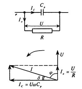 Рис. 4.1. Паралельна еквівалентна схема діелектрика з втратами та векторна діаграма для неї. Комплексним і найбільш інформативним параметром діелектричного матеріалу, що відображає сумарні втрати енергії в діелектрику при його поляризації, є тангенс кута діелектричних втрат. Визначення поняття кута діелектричних втрат випливає з рис. 4.1. У реальному діелектрику, розміщеному між двома контактами, фазовий зсув між струмом і напругою або, що теж саме, між вектором повного струму і його реактивною складовою складає кут (р = л/2. Поява відхилення фазового кута від тг/2 обумовлена як наявністю наскрізної електропровідності діелектрика, так і релаксаційним характером деяких механізмів поляризації. Практичне значення поняття \%(р складається в тому, що він визначає втрати потужності в діелектрику в змінному електричному полі: р^и^Сї^, де а>, Й - частота і напруга прикладена до діелектрика, С -електрична ємність системи. Очевидно, що діелектричні втрати призводять до розігріву матеріалу. Якщо матеріал знаходиться між металевими електродами, то, виходячи з рівняння теплового балансу Рд = Ру, можна показати, що зміна температури системи визначається а - коефіцієнт теплопередачі від діелектрика, S - площа поверхні діелектрика. Таким чином, втрати на змінному струмові, на відміну від втрат на постійному струмові, що відповідають закону Джоуля-Ленца, визначаються частотною залежністю діелектричної проникності і тангенса кута втрат. Розміри внесків втрат через наскрізну електропровідність і втрат за рахунок релаксаційних механізмів поляризації в загальний розмір втрат далеко неоднозначні, і у різноманітних умовах кожний із них може мати переважний характер. Загальна тенденція в частотній залежності втрат усе ж спостерігається. Дійсно, із підвищенням частоти поля починає позначатися інерційність процесу поляризації, і втрати від цього зменшуються. У той же час із ростом частоти починають різко зростати втрати в металевих обкладках конденсаторів, що призводить до необхідності зменшувати струми через елементи. Останній чинник особливо актуальний для НВЧ техніки, де необхідність зменшення втрат надзвичайно важлива. Важливим параметром діелектрика, що обмежує діапазон його застосування, є його електрична міцність. Електрична міцність - спроможність діелектрика зберігати високий питомий опір у полях високої напруженості. Електрична міцність є комплексним параметром, досить складним чином залежним від умов його вимірювання. Електрична міцність матеріалу визначається механізмом пробою діелектрика. Розрізняють такі типові механізми пробою. Тепловий пробій обумовлений експоненціальним ростом електропровідності при підвищенні температури. При проходженні електричного струму через діелектрик відбувається його розігрівання і, якщо відвід теплової енергії не компенсує її виділення, то теплова рівновага стає неможливою. Температура діелектрика починає підвищуватися, причому як правило, в найбільш дефектній локальній області, що призводить до змін властивостей матеріалу (випар, плавлення) із наступною його руйнацією. Тепловий пробій - явище інерційне, тобто для його здійснення необхідно визначений час. Тобто навіть короткочасне перевищення пробивної напруги в декілька разів може бути недостатнім для розвитку пробою. Тепловий 