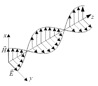 Будь-яка функція, що задовольняє хвильовому рівнянню (5.4), описує деяку хвилю. Змінне електричне поле породжує змінне магнітне поле, яке, в свою чергу, породжує електричне поле. Таким чином, у просторі виникає послідовність взаємних перетворень електричного і магнітного полів, що поширюються від точки до точки. Цей процес періодичний у просторі й часі і, отже, є хвилею. Висновок про можливість існування електромагнітних хвиль випливає з теорії електромагнітного поля Максвеллла. Розглянемо плоску електромагнітну хвилю, що поширюється вздовж осі z в однорідному непровідному середовищі. З рівнянь електромагнітного поля випливає