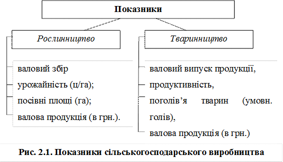 Сільське господарство належить до важливих галузей матеріального виробництва. Це єдина галузь, яка забезпечує потреби населення у продуктах харчування та постачає необхідну сільськогосподарську сировину галузям промисловості, що випускають продукти харчування для населення. Таким чином, сільське господарство – це сфера виробництва, призначення якої полягає у забезпеченні галузей народного господарства засобами виробництва (сировиною), а населення – предметами споживання. Сільське господарство включає 2 підгалузі: рослинництво та тваринництво. Сільськогосподарське виробництво, перш за все рослинництво, має такі особливості: - сезонний характер виробництва продукції рослинництва; - головним засобом сільськогосподарського виробництва є земля, яка у процесі постійного використання зменшує свою родючість, але не підлягає заміні. Крім того, мають місце значні відмінності у родючості земельних угідь; - сільськогосподарське виробництво пов’язане з живими організмами, які розвиваються згідно законам природи; - сільське господарство ведеться на значних площах, що визиває великий обсяг внутрівиробничих перевезень; - частина виробленої продукції цієї галузі використовуються як засоби виробництва (до 40%); - результати сільськогосподарського виробництва багато в чому залежать від природно-кліматичних умов; - значним покупцем сільськогосподарської продукції є держава, яка скуповує у порядку державного замовлення певний обсяг необхідних ресурсів. Головне завдання сільськогосподарського виробництва – зростання виробництва сільськогосподарської продукції з найменшими витратами на одиницю продукції та найбільш повне задоволення потреб населення якісними продуктами харчування та переробних галузей сировиною. З огляду на те, що у складі сільського господарства виділяють дві суттєво від’ємні підгалузі, результати сільськогосподарського виробництва вимірюються двома відповідними групами показників (див рис. 2.1.)