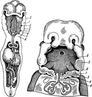 Органы дыхания закладываются в конце 3-й недели жизни зародыша в форме выроста вентральной стенки передней кишки тотчас сзади зачатка щитовидной железы. Этот полый вырост на своем каудальном конце скоро подразделяется на две части соответственно будущим двум легким; краниальный его конец образует гортань, а за ней, каудальнее, находится зачаток трахеи (рис. 161). Гортань достигает окончательного развития в период полового созревания: у мужчин она растет сильнее и поэтому больших размеров, чем у женщин. Перед наступлением половой зрелости у мальчиков наблюдается резкое усиление роста гортани, причем в это время у них изменяется («ломается») голос. Гортань мужчины в среднем на '/з больше женской. Длина ее у мужчин в среднем 44 мм, у женщин — 36 мм. Влияние половых желез на гортань доказывается и тем, что у евнухов голос становится похожим на женский.