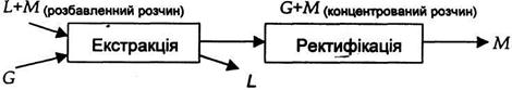 В більшості випадків екстракція використовується разом з ректифікацією. Нехай в розчиннику L розчинна розподіляюча речовин М, і концентрація розчину (вихідної суміші) незначна. Можна підібрати другий розчинник G (екстрагент) і очищений від речовини, що розподіляється, розчинник L (рафінат). Оскільки витрата тепла на ректифікацію різко зменшується з ростом концентрації вихідної речовини, яка розділяється, в суміші, попереднє екстрагування дозволяє значно зменшити затрати тепла на розділення вихідної суміші. Принципова схема поєднання і ректифікації показана на рис. 11.0.1