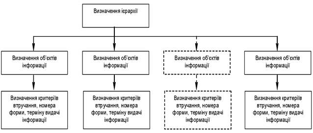 Рис. 1. Структура інформаційної системи як сукупність забезпечуючих підсистем. Серед таких підсистем виділяють інформаційне, технічне, математичне, програмне, організаційне й правове забезпечення. 2. Інформаційне забезпечення Призначення підсистеми інформаційного забезпечення полягає в сучасному формуванні й видачі достовірної інформації для прийняття управлінських рішень. Інформаційне забезпечення - сукупність єдиної системи класифікації і кодування інформації, уніфікованих систем документації, схем інформаційних потоків, що циркулюють в організації, а також методологія побудови баз даних. Уніфіковані системи документації створюються на державному, республіканському, галузевому й регіональному рівнях. Головна їх мета - забезпечення порівнянності показників різних сфер суспільного виробництва. Розроблено стандарти, де встановлюються вимоги: - до уніфікованих систем документації; - до уніфікованих форм документів різних рівнів керування; - до складу й структури реквізитів і показників; - до порядку впровадження, ведення і реєстрації уніфікованих форм документів. Однак незважаючи на існування уніфікованої системи документації, при обстеженні більшості організацій постійно виявляється цілий комплекс типових недоліків: - надзвичайно великий обсяг документів для ручної обробки; - ті самі показники часто дублюються в різних документах; - робота з більшою кількістю документів відволікає фахівців від вирішення безпосередніх завдань; - є показники, які створюються, але не використаються, та ін. Тому усунення зазначених недоліків є одним із завдань, що стоять при створенні інформаційного забезпечення. Схеми інформаційних потоків відбивають маршрути руху інформації і її обсягів, місця виникнення первинної інформації і використання результатної інформації. За рахунок аналізу структури подібних схем можна виробити заходи щодо вдосконалення всієї системи керування. Приклад 9. Як приклад найпростішої схеми потоків даних можна навести схему, де відбиті всі етапи проходження службової записки або запису в базі даних про прийом на роботу співробітника - від моменту її створення до виходу наказу про його зарахування на роботу. Побудова схем інформаційних потоків, що дозволяють виявити обсяги інформації й провести її детальний аналіз, забезпечує: - виключення дублюючої й невикористовуваної інформації; - класифікацію і раціональне подання інформації. При цьому докладно повинні розглядатися питання взаємозв'язку руху інформації з рівнів керування. Варто виявити, які показники необхідні для прийняття управлінських рішень, а які ні. До кожного виконавця повинна надходити тільки та інформація, що використовується. Методологія побудови баз даних базується на теоретичних основах їхнього проектування. Для розуміння концепції методології наведемо основні її ідеї у вигляді двох послідовно реалізованих на практиці етапів: 1-й етап - обстеження всіх функціональних підрозділів фірми з метою: - зрозуміти специфіку й структуру її діяльності; - побудувати схему інформаційних потоків: - проаналізувати існуючу систему документообігу; - визначити інформаційні об'єкти й відповідний склад реквізитів (параметрів, характеристик), що описують їхні властивості й призначення. 2-й етап - побудова концептуальної інформаційно-логічної мо