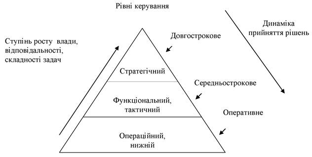 Рис.1. Послідовність процесу формування таблиці регламентуючої інформації Особливістю використання таблиці регламентуючої інформації є те, що з неї виділяється спеціальна її частина, яка, з одного боку, призначена лише для менеджерів, функції яких пов’язані з конкретним об’єктом управління, з іншого - виділяються об’єкти інформації, які пов’язані з конкретним об’єктом управління. 4. Рівні керування Структура керування будь-якої організації традиційно ділиться на три рівні: - операційний, - функціональний; - стратегічний. Рівні керування (вид управлінської діяльності) визначаються складністю розв'язуваних завдань. Чим складніше завдання, тим більш високий рівень керування потрібний для його вирішення. При цьому слід розуміти, що простіших завдань, які вимагають негайного (оперативного) вирішення, виникає значно більше, а виходить, і рівень керування для них потрібний інший - більш низький, де приймаються рішення оперативно. При керуванні необхідно також ураховувати динаміку реалізації прийнятих рішень, що дозволяє розглядати керування під кутом тимчасового фактора. На рис. 2 зображені три рівні керування, які співвіднесені з такими факторами, як ступінь зростання влади, відповідальності, складності розв'язуваних завдань, а також динаміка прийняття рішень з реалізації завдань.
