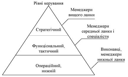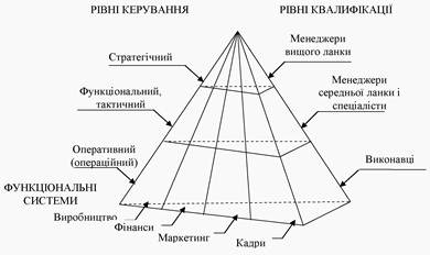 Рис. 2. Піраміда рівнів керування, що відображує зростання влади, відповідальності, складності й динаміку прийняття рішень Операційний (нижній) рівень керування забезпечує вирішення багаторазово повторюваних завдань і операцій і швидке реагування на зміни вхідної поточної інформації. На цьому рівні досить великий як обсяг виконуваних операцій, так і динаміка прийняття управлінських рішень. Цей рівень керування часто називають оперативним через необхідність швидкого реагування на зміну ситуації. На рівні оперативного (операційного) керування великий обсяг займають облікові завдання. Приклад 1. Деякі облікові завдання: - облік кількості проданої продукції; - облік витрат часу, сировини й матеріалів при виконанні окремих виробничих операцій; - облік зробленої продукції; - бухгалтерський облік і т.д. Функціональний (тактичний) рівень керування забезпечує рішення завдань, що вимагають попереднього аналізу інформації, підготовленої на першому рівні, На цьому рівні великого значення набуває така функція керування, як аналіз. Обсяг розв'язуваних завдань зменшується, але зростає їхня складність. При цьому не завжди вдається виробити потрібне оперативне рішення, бо потрібне додатковий час на аналіз, осмислення, збір відсутніх відомостей і т.п. Керування пов'язане з деякою затримкою від моменту надходження інформації до прийняття рішень і їхньої реалізації, а також від моменту реалізації рішень до одержання реакції на них. Приклад 2. На підставі аналізу статистичних даних про попиту на продукцію, про ціни конкурентів та ін. прогнозується прибуток і розробляється план випуску продукції на найближчий період (тиждень, місяць, квартал). Результати прийнятих управлінських рішень проявляються через деякий час. Стратегічний рівень забезпечує вироблення управлінських рішень, спрямованих на досягнення довгострокових стратегічних цілей організації. Оскільки результати прийнятих рішень проявляються через тривалий час, особливе значення на цьому рівні має така функція керування, як стратегічне планування. Інші функції керування на цьому рівні в цей час розроблені недостатньо повно. Часто стратегічний рівень керування називають стратегічним або довгостроковим плануванням. Правомірність прийнятого на цьому рівні рішення може бути підтверджена через досить тривалий час (можуть пройти місяці або роки). Відповідальність за прийняття управлінських рішень надзвичайно велика й визначається не тільки результатами аналізу з використанням математичного й спеціального апарата, але й професійною інтуїцією менеджерів. Приклад 3. На підставі аналізу фінансового стану фірми приймаються рішення про збільшення (зменшення, зняття із продажу) виробленої продукції, про залучення додаткових працівників або про їхнє скорочення. Персонал організації – це співробітники різного ступеня кваліфікації й рівнів керування - від секретарів, які виконують найпростіші типові операції обробки, до фахівців і менеджерів, які приймають стратегічні рішення. На рис. 3 показана відповідність різних рівнів кваліфікації персоналу рівням керування: - на верхньому, стратегічному, рівні керування - менеджери вищої ланки керівництва організації (фірми і його заступників). Основне їхнє завдання -стратегічне планування діяльності фірми на ринку й координація вну