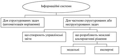 Рис. 1. Класифікація інформаційних систем за ознакою структурованості розв'язуваних завдань Інформаційні системи, що створюють управлінські звіти, забезпечують інформаційну підтримку користувача, тобто надають доступ до інформації в базі даних і її часткову обробку. Процедури маніпулювання даними в інформаційній системі повинні забезпечувати наступні можливості: - складання комбінацій даних, одержуваних з різних джерел; - швидке додавання або виключення того або іншого джерела даних і автоматичне перемикання джерел при пошуку даних; - керування даними з використанням можливостей систем керування базами даних; - логічну незалежність даних цього типу від інших баз даних, що входять у підсистему інформаційного забезпечення; - автоматичне відстеження потоку інформації для наповнення баз даних. Інформаційні системи, що розробляють альтернативи рішень, можуть бути модельними й експертними. Модельні інформаційні системи надають користувачеві математичні, статичні, фінансові та інші моделі, використання яких полегшує вироблення і оцінку альтернатив рішення. Користувач може одержати відсутню йому для ухвалення рішення інформацію шляхом установлення діалогу з моделлю у процесі її дослідження. Основними функціями модельної інформаційної системи є: - можливість роботи в середовищі типових математичних моделей, включаючи рішення основних завдань моделювання типу "як зробити, щоб?", "що буде, якщо?", аналіз чутливості та ін.; - досить швидка й адекватна інтерпретація результатів моделювання; - оперативна підготовка й коректування вхідних параметрів і обмежень моделі; - можливість графічного відображення динаміки моделі; - можливість пояснення користувачеві необхідних кроків формування і роботи моделі. Експертні інформаційні системи забезпечують вироблення й оцінку можливих альтернатив користувачем за рахунок створення експертних систем, пов'язаних з обробкою знань. Експертна підтримка прийнятих користувачем рішень реалізується на двох рівнях. Робота першого рівня експертної підтримки виходить із концепції "типових управлінських рішень", відповідно до якої часто виникаючі у процесі керування проблемні ситуації можна звести до деяких однорідних класів управлінських рішень, тобто до деякого типового набору альтернатив. Для реалізації експертної підтримки на цьому рівні створюється інформаційний фонд зберігання й аналізу типових альтернатив. Якщо проблемна ситуація не асоціюється з наявними класами типових альтернатив, у роботу повинен вступати другий рівень експертної підтримки управлінських рішень. Цей рівень генерує альтернативи на базі наявних в інформаційному фонді даних, правил перетворення і процедур оцінки синтезованих альтернатив. 2. Класифікація інформаційних систем за функціональною ознакою і рівнем керування Функціональна ознака визначає призначення підсистеми, а також її основні цілі, завдання і функції. Структура інформаційної системи може бути подана як сукупність її функціональних підсистем, а функціональна ознака може бути використана при класифікації інформаційних систем. У г осподарській практиці виробничих і комерційних об'єктів типовими видами діяльності, які визначають функціональну ознаку класифікації інформаційних систем, є: виробнича, маркетингова, фінансова, кадрова. Вироб