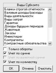 При виборі видів субконто рахунку у формі, зображеній на рис. 2.3, за допомогою відповідних прапорців визначається необхідність ведення кількісного, валютного, вартісного обліку та визначення лише оборотів без сальдо для вибраного виду субконто.