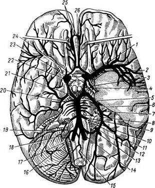 Рис. 222. Подключичная артерия, общая сонная артерия и ветви наружной сонной артерии. 1 — a. temporalis superficialis; 2 -a. occipitalis; 3 — a. vertebralis; 4 — a. carotis interna; 5 — a. caro-tis externa; б — a. vertebralis; 7 — a. cervicalis profunda; 8 — a. cervicalis superficialis; 9 — a. trans-versa colli; 10 — a. suprascapu-laris; 11-a. subclavia; 12, 13 — a. supraorbitalis; 14 — a. angu-laris; 15 —a. maxillaris; 16 — a. buccalis; 17 — a. alveolaris inferior; 18 — a. facialis; 19 — a. lingualis; 20 — a. thyroidea superior; 21 — a. carotis communis; 22 — a. cervicalis ascendens; 23 — a. thyroidea inferior; 24 — truncus thyrocervicalis; 25 — a. thoracica interna. ного мозга. В результате вдоль спинного мозга спускаются три артериальных ствола: непарный — по передней поверхности (a. spinalis anterior) и два парных — по заднебоковой поверхности, по одному с каждой стороны (аа. spinales posteriores). На всем пути до нижнего конца спинного мозга они получают через межпозвоночные отверстия подкрепления в виде гг. spindles: в области шеи — от аа. vertebrales, в грудном отделе — от аа. intercos-tales posteriores, в поясничном — от аа. lumbales. Через эти ветви устанавливаются анастомозы позвоночной артерии с подключичной артерией и нисходящей аортой; в) а. Cerebelli inferior posterior — самая крупная из ветвей a. vertebralis (см. рис. 221), начинается близ моста, направляется назад и, обходя продолговатый мозг, разветвляется на нижней поверхности мозжечка. A. basilaris, базилярная артерия, получается от слияния обеих позвоночных, непарная, ложится в срединную борозду моста, у переднего края его делится на две аа. cerebri posteribres (по одной с каждой стороны), которые направляются назад и вверх, огибают боковую поверхность ножек мозга и разветвляются на нижней, внутренней и наружной поверхностях затылочной доли. Принимая в себя описанные выше аа. communicantes posteriores от a. carotis interna, задние мозговые артерии участвуют в образовании артериального круга большого мозга, circulus arteriosus cerebri. От ствола a. basilaris отходят небольшие веточки к мосту, во внутреннее ухо, проходящие через meatus acusticus interims, и две ветви к мозжечку: a. cerebelli inferior anterior и a. cerebelli superior. A. vertebralis, проходящая параллельно стволу общей сонной артерии и участвующая наряду с ней в кровоснабжении мозга, является коллатеральным сосудом для головы и шеи. Слившиеся в один ствол, a. basilaris, две позвоночные артерии и слившиеся в один ствол две аа. spinales anteriores, образуют артериальное кольцо, которое наряду с circulus arteriosus cerebri имеет значение для коллатерального кровообращения продолговатого мозга.