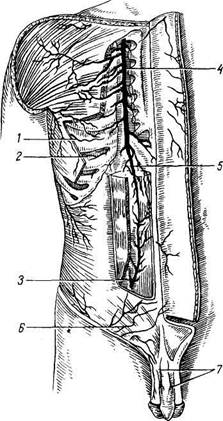 2. Truncus thyrocervicalis, щитошейный ствол, отходит от a. subclavia перегибаясь через lig. transversum scapulae, разветвляется в дорсальных мышцах лопатки; анастомозирует с a. circumf-lexa scapulae. 3. A. thoracica interim, внутренняя Рис. 223. Внутренняя грудная и нижняя надчревная артерии. / — a. intercostalis posterior; 2 — a. musculophrenica; 3 — a. epigastrica inferior; 4 — a. thoracica interna; J — a. epigastrica superior; 6 — a. epigastrica superficia-lis; 7 — aa. dorsales penis. На своем пути a. thoracica interna дает ветви к ближайшим анатомическим образованиям: соединительной ткани переднего средостения, вилочко-вой железе, нижнему концу трахеи и бронхам, к шести верхним межреберным промежуткам и молочной железе. Ее длинная ветвь, a. pericar-diacophrenica, вместе с п. phrenicus идет к диафрагме, давая по пути веточки к плевре и перикарду. Ее rami intercostdles anteribres идут в верхних шести межреберных промежутках и анастомозируют с аа. intercostdles posteriores (из аорты). Ветви второго отдела подключичной артерии: 4. Truncus costocervicalis, реберно-шейный ствол, отходит в spatium Ветви третьего отдела подключичной артерии: 5. A. transversa colli, поперечная артерия шеи, прободает plexus brachialis, Подмышечная артерия Непосредственным продолжением подключичной артерии является подмышечная артерия, а. ах Шаг is (рис. 224), которая в свою очередь продолжается в плечевую артерию. Проксимальной границей ствола подмышечной артерии служит наружный край I ребра, дистальной границей — нижний край m. teres major (место начала плечевой артерии). Подмышечная артерия лежит в cavitas axillaris медиально от плечевого сустава и плечевой кости; спереди и медиальнее ее располагается v. axillaris и с трех сторон — нервные стволы плечевого сплетения; снизу этот сосудисто-нервный пучок прикрыт кожей, фасцией и скоплением жировой клетчатки, содержащей лимфатические узлы. По ходу a. axillaris различают три отдела: 1) от ключицы до верхнего края, m. pectoralis minor (trigonum clavipectorale); 2) позади этой мышцы (trigonum pectorale); 3) от нижнего края m. pectoralis minor до нижнего края т. pectoralis major (trigonum subpectorale). Ветви a. axillaris в trigonum clavipectorale: 1. A. thoracica superior, верхняя грудная артерия, разветвляется 2. A. thoracoacromialis, грудоакромиальная, принимает участие в питании В trigonum pectorale: 3. A. thoracica lateralis, латеральная грудная артерия, спуска В trigonum subpectorale: 4. A. subscapularis, подлопаточная артерия, самая крупная ветвь 5. A. circumflexa humeri posterior, задняя артерия, огибающая