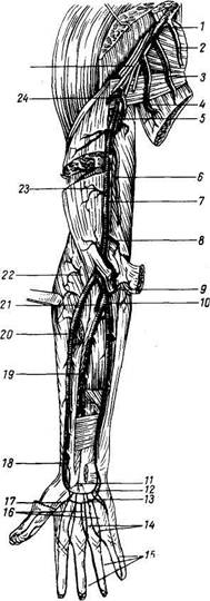 / — a. axillaris; 2 — мышечная ветвь; 3 — a. thoracica late-ralis; 4 — a. subscapularis и ее ветвь a. thoracodorsalis; 5 — a. profunda brachii; б — a. collateralis ulnaris superior; 7 — a. brachialis; 8 — a. collateralis ulnaris inferior; 9 — a. reccurens ulnaris; iO - a. ulnaris; 11 - rete carpi palmare; 12 — arcus palmaris profundus; 13 — arcus palmaris superfi-cialis; 14 — aa. metacarpeae palmares; 15 — aa. digitales pal-mares propriae; 16 — aa. digitales palmares communes; 17 — a. princeps pollicis; 18, 20 — a. radialis; 79 — a. interossea anterior; 21—a., interossea communis; 22 — a. recurrens radialis; 23 — rr. musculares; 24 — a. circumflexa humeri posterior; 25 — plexus brachialis. Плечевая артерия Плечевая артерия, а. brachialis (рис. 225), является непосредственным продолжением подмышечной артерии. Начавшись у нижнего края m. teres major, она тянется в sulcus bicipitalis до локтевого сгиба, где на уровне шейки лучевой кости делится на свои конечные ветви — лучевую и локтевую артерии. На своем пути в sulcus bicipitalis medialis она сопровождается двумя плечевыми венами и нервами (п. medianus, n. ulnaris, п. cutaneus brachii medialis et n. cutaneus antebrachii medialis). Кроме небольших веточек к кости и мышцам, плечевая артерия дает следующие ветви: 1. A. profunda brachii, глубокая артерия плеча, отходит от a. brachialis вскоре после начала последней; представляет собой крупную ветвь, которая вместе с п. radialis проходит в canalis humeromuscu-laris, отдает на пути артерию, питающую плечевую кость (a. diaphyseos humeri), и распадается на a. collateralis media, проникающую в толщу m. triceps и анастомозирую-щую с a. interossea recurrens (из a. interossea posterior), и a. collateralis radialis; последняя выходит на поверхность через нижнее отверстие спирального канала, идет кпереди от epicondylus lateralis и анастомозирует с a. recurrens radialis (ветвь a. radialis). Глубокая плечевая артерия часто (50 %) отходит вместе с другими ветвями плечевой или подмышечной артерий или (30 %) отсутствует. 2. A. collateralis ulnaris superior, верхняя локтевая коллатеральная 3. A. collateralis ulnaris inferior, нижняя локтевая коллатеральная Лучевая артерия Лучевая артерия, a. radialis, по направлению является продолжением плечевой артерии. Она идет медиально от m. brachioradialis, сначала прикрытая им, а далее в sulcus radialis; в нижней трети предплечья, где мышцы переходят в сухожилия, лучевая артерия покрыта с поверхности лишь фасцией и кожей, почему и служит ввиду легкой доступности для исследования пульса. Дойдя до верхушки шиловидного отростка лучевой кости, a. radialis переходит на тыл, огибая латеральный край запястья и ложась в так называемой табакерке, откуда выходит на ладонь в первом межкостном промежутке между основаниями I и II пястных костей. На ладони лучевая артерия вместе с глубокой ветвью a. ulnaris образует arcus palmaris profundus — глубокую ладонную дугу (см. рис. 225). Ветви лучевой артерии: 1. A. recurrens radialis, возвратная лучевая артерия, начинается 2. Rami musculares — к окружающим мышцам. 3. Ramus carpeus palmaris, ладонная запястная ветвь, начинается 4. Ramus palmaris superficialis, поверхностная ладонная ветвь,