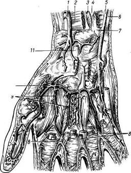 1 — a. radialis; 2 — m. pronator quadratus; 3 — a. interossea anterior; 4 — membrana interossea; 5 — a. ul'naris; 6 — сухожилие m. flexoris carpi ulnaris; 7 —ulna; 8 — aa. digitales palmares communes; 9 — aa. metacarpeae palmares; 10 — arcus palmaris profundus; 11 — сухожилие m. flexoris carpi radialis. На ладони имеются две дуги — поверхностная и глубокая.