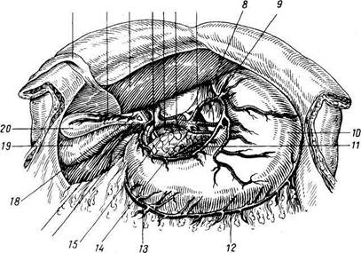 Рис. 229. Чревный ствол и его ветви. 1 — lig. teres hepatis; 2 — a. cystica; 3 — левая доля печени; 4, 16 — ductus choledochus; 5 — v. portae; 6 — v. cava inferior; 7 — a. gastrica sinistra; S — truncus celiacus; 9 — aorta abdominalis; 70 — ventriculus; 7/ — pancreas; /2 — a. gastroepiploica sinistra; 13 — a. gastroepiploica dextra; 14 — a. lienalis; /5 — a. hepatica communis; 17 — ductus cysticus; 18 — ductus hepaticus communis; 19 — правая доля печени; 20 — vesica fellea. Близ разделения на конечные ветви селезеночная артерия дает a. gastroepiploica sinistra, которая вдоль большой кривизны желудка идет слева направо и, соединившись с a. gastroepiploica dextra, образует (непостоянную) артериальную дугу, подобную дуге на малой кривизне. От дуги отходят многочисленные веточки к желудку. Кроме того, после отхождения a. gastroepiploica sinistra от селезеночный артерии к желудку идут многочисленные аа. gastricae breves, которые могут вполне компенсировать затруднение кровотока в основных четырех артериях желудка. Последние образуют вокруг желудка артериальное кольцо, или венец, состоящий из двух дуг, расположенных по малой (аа. gastricae sinistra et dextra) и большой (аа. gas-troepiploicea sinistra et dextra) кривизнам. Поэтому их называют также венечными артериями. 2. A. mesenterica superior, верхняя брыжеечная артерия, отходит от передней поверхности аорты тотчас ниже червного ствола, идет вниз и вперед, в щель между нижним краем поджелудочной железы спереди и горизонтальной частью двенадцатиперстной кишки сзади, входит в брыжейку тонкой кишки и спускается к правой подвздошной ямке. Ветви, a. mesentericae superioris: a) a. pancreaticoduodeiialis inferior направляется вправо по вогнутой стороне duodeni навстречу аа. pancreaticoduode-nales superiores; б) аа. intestinales — 10—16 ветвей, которые отходят от a. mesenterica superior в левую сторону к тощей (аа. jejunales) и подвздошной (аа. ilei) кишке; по пути они делятся дихотомически и соседними ветвями соединяются друг с другом, отчего получается вдоль аа. jejunales три ряда дуг, а вдоль аа. ilei — два ряда. Дуги являются функциональным приспособлением, обеспечивающим приток крови к кишечнику при любых движениях и положениях его петель. От дуг отходит много тонких веточек, которые кольцеобразно охватывают кишечную трубку; в) a. ileocolica от- ходит от av mesenterica superior вправо, снабжая веточками нижний участок intestinum ileum и слепую кишку и посылая к червеобразному отростку a. appendiculdris, проходящую позади конечного отрезка подвздошной кишки; г) a. colica dextra направляется позади брюшины к colon ascendens и возле нее делится на две ветви: восходящую (идет вверх навстречу a. colica media) и нисходящую (спускается навстречу a. ileocolica); от образующихся дуг отходят ветви к прилежащим отделам толстой кишки; д) a. colica media проходит между листками mesocolon transversum и, достигнув поперечной ободочной кишки, делится на правую и левую ветви, которые расходятся в соответствующие стороны и анастомозируют: правая ветвь — с a. colica dextra, левая — с a. colica sinistra (см. далее). 3. A. mesenterica inferior, нижняя брыжеечная артерия, отходит на уровне нижнего края III поясничного позвонка (на один позвонок выше деления аорты) и направляется вниз и несколько влево, располагаясь позади брюшины на передней поверхности левой поясничной мышцы. Ветви нижней брыжеечной артерии: a) a. colica sinistra делится на две ветви: восходящую, которая идет по направлению к flexura coli sinistra навстречу a. colica media (от a. mesenterica superior), и нисходящую, которая соединяется с аа. sigmoideae; б) аа. sigmoideae, обычно две к colon sigmoideum, восходящими ветвями анастомозируют с ветвями a. colica sinistra, нисходящими — с в) a. rectal is superior. Последняя является продолжением a. mesenteric