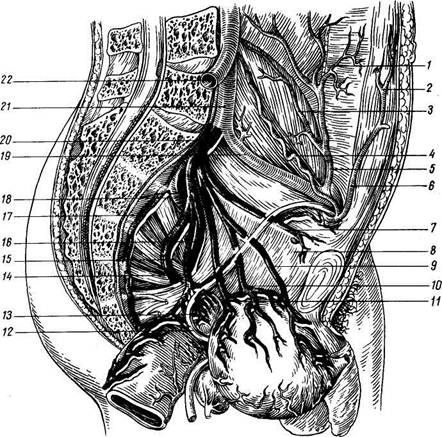 Рис. 230. Пристеночные и внутренностные артерии левой части мужского таза. Мочевой пузырь и прямая кишка отвернуты направо и вниз. / — ветви a. circumflexae ilium profundae к m. transversus abdominis; 2, б — a. epigastrica inferior; 3 - ветви к m. illiacus; 4 - a. testicularis; 5 — a. circumflexa ilium profunda; 7 - a. obtu-ratoria; 8 — a. umbilicalis; 9 - a. vesicalis superior; 10 — добавочная ветвь к мочевому пузырю; 11 — a. vesicalis inferior; 12 — ductus deferens sinister; 13 - vesicula seminalis; 14 — a. rectalis media и ее ветвь a. ductus deferentis; 15 — &. glutea inferior; 16 - a. pudenda interna; 17 - a. sacralis lateralis; /S-a. glutea superior; 19 — 3.. iliaca externa; 20 - a. iliaca interna; 21 - a. iliaca communis sinistra; 22-a. iliaca communis dextra. 1. A. Biolumbalis, подвздошно-поясничная артерия, попадает в fossa iliaca, где анастомозирует с. a. circumflexa Ilii profunda от a. iliaca externa. 2. A. sacralis lateralis, латеральная крестцовая артерия, 3. A. glutea superior, верхняя ягодичная артерия, представ 4. A. obturatoria, запирательная артерия, направляется к за-пирательному отверстию. По выходе из запирательного канала она питает m. obturatorius externus, аддукторы и дает rdmus acetabuldris. Эта последняя через incisura acetabuli проникает в тазобедренный сустав и питает lig. capitis femoris и головку бедренной кости. 5. A. glutea inferior, нижняя ягодичная артерия, проходит через foramen infrapiriforme вместе с a. pudenda interna и п. ischiadicus, которому она дает длинную тонкую веточку — a. cbmitans n. ischiadici. Выйдя из полости таза, a. glutea inferior дает мышечные веточки к ягодичным и другим ближайшим мышцам. Висцеральные ветви a. iliaca interna: 1. A. umbilical is, пупочная артерия, сохраняет у взрослого просвет лишь на небольшом протяжении — от начала до места отхождения от нее верхней пузырной артерии, остальной участок ее ствола до пупка облите-рируется и превращается в lig. umbilicale mediale. 2. Rami ureterki — к мочеточнику (могут отходить от a. umbilicalis). 3. Аа. veskales superior et inferior: верхняя пузырная артерия 4. A. ductus deferentis, артерия семявы носящего протока 5. A. uterina, маточная артерия (у женщин), отходит или от 6. A. rectalis media, средняя прямокишечная артерия, от 7. A. pudenda interna, внутренняя половая артерия, в тазу Наружная подвздошная артерия A. iliaca externa (см. рис. 230), начавшись на уровне крестцово-подвздошного сочленения, тянется вниз и вперед по медиальному краю m. psoas до паховой связки и по выходе на бедро называется бедренной артерией. Кроме веточек к m. psoas, a. iliaca externa дает две