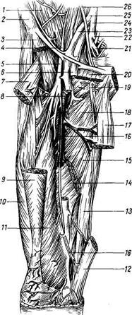 Рис. 231. Топография глубокой артерии правого бедра; вид спереди. 1 — подвздошная мышца; 2 — передняя верхняя ость подвздошной кости; 3, 12 — части портняжной мышцы; 4 — п. femoralis; 5 — a. femoralis (средняя часть ее удалена); 6 — v. femoralis; 7, 9 — части прямой мышцы бедра; 8 — a. profunda femoris; 10,11 — латеральная и медиальная головки четырехглавой мышцы бедра; 13 — тонкая мышца; 14, 15 — части большой приводящей мышцы; 16 —п. saphenus; 17 — часть длинной приводящей мышцы; 18 — короткая приводящая мышца; 19 —п. obturatorius; 20 — часть гребенчатой мышцы; 21, 22 — a. glutea inferior и a. glutea superior; 23 — a. iliaca externa; 24 — a. iliaca interna; 25 — a. iliaca communis; 26 — мочеточник. крупные ветви, отходящие возле самой паховой связки. 1. A. epigastrica inferior, нижняя над 2. A. circumtlexa flium profunda, глубо Артерии свободной нижней конечности Бедренная артерия A. femoralis, бедренная артерия, представляет продолжение ствола наружной подвздошной артерии, получая свое название от места прохождения под паховой связкой через lacuna vasorum близ середины протяжения этой связки. Для остановки кровотечения бедренную артерию прижимают у места ее выхода на бедро к os pubis. Медиально от бедренной артерии лежит бедренная вена, вместе с которой она проходит в бедренном треугольнике, идя сначала в sulcus iliopectineus, затем в sulcus femoralis anterior, и далее проникает через canalis adductorius в подколенную ямку, где продолжается в a. poplitea. Ветви a. femoralis: 1. A. epigastrica superficial is, поверхностная надчревная арте 2. A. circumflexa ilium superficialis, поверхностная артерия,