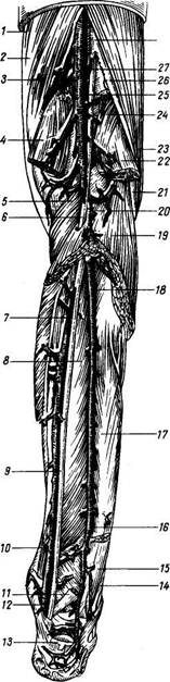 1 — тонкая мышца; 2 — полусухожильная мышца; 3 — полуперепончатая мышца; 4, 22 — медиальная и латеральная головки икроножной мышцы; 5 — подколенная мышца; 6, 9, 27 — п. tibialis; 7, 12 — a. tibialis posterior; 8 — задняя большеберцовая мышца; 10 — длинный сгибатель пальцев; 11, 17 — длинный сгибатель I пальца (средняя часть мышцы удалена); 13 — пяточное сухожилие; 14 — длинная малоберцовая мышца; 15 — короткая малоберцовая мышца; 16, 18 — а. регопеа; 19 — камбаловидная мышца; 20 — a. tibialis anterior; 21, 26 — п. peroneus communis; 23 — двуглавая мышца бедра; 24 — подошвенная мышца; 25 — a. poplitea; 28 — п. ischiadicus. 3. Аа. pudendae externae, наружные поло 4. A. profunda femoris (рис. 231), глубокая Ветви а. рг о fun da femori s: a) a. circum-flexa femoris medialis, направляясь медиально и вверх, дает ветви к m. pectineus, приводящим мышцам бедра, и к тазобедренному суставу; б) a. cir-cumflexa femoris lateralis отходит несколько ниже предыдущей, направляется в латеральную сторону под m. rectus, где делится на ramus ascendens (направляется вверх и латерально к большому вертелу) и ramus descendens (разветвляется в т. quadriceps); в) аа. perforantes (три) отходят от задней поверхности глубокой артерии бедра и, прободая приводящие мышцы, переходят на заднюю поверхность бедра; первая прободающая артерия дает к бедру верхнюю питающую бедро артерию (a. diaphyseos femoris superior), а третья — нижнюю (a. diaphyseos femoris inferior); aa. perforantes приобретают первостепенное значение при перевязке бедренной артерии ниже уровня отхождения глубокой артерии бедра. 5. Rami musculares бедренной артерии — к 6. A. genus descendens, нисходящая арте Подколенная артерия A. poplitea, подколенная артерия, представляет собой непосредственное продолжение бедренной артерии. В подколенной ямке a. poplitea располагается на самой кости (где ее можно прижать к кости при полусогнутом положении конечности) и задней^ поверхности суставной капсулы кпереди и несколько медиально от v. poplitea; далее книзу артерия ложится на заднюю поверхность m. popliteus прикрытая головками m. gastrocnemius, и затем, подойдя под край m. soleus, делится на две свои конечные ветви (аа. ti-biales anterior et posterior). Ветви a. poplitea (рис. 232). 1. Aa. genus superiores lateralis et medfflis, верхние коленные 2. Аа. genus inferiores lateralis et medialis, нижние коленные ар 3. A. genus media, средняя коленная артерия, отходит на