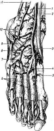 Передняя большеберцовая артерия A. tibialis anterior, передняя болыиебер-цовая артерия, представляет собой одну из двух конечных ветвей подколенной артерии (меньшую по калибру). Тотчас после начала она прободает глубокие мышцы сгибательной поверхности голени и через отверстие в межкостной перепонке уходит в переднюю область голени, проходит между m. tibialis anterior и т. extensor digitorum longus, а ниже лежит между m. tibialis anterior и т. extensor hallucis longus. Над голеностопным суставом она проходит поверхностно, прикрытая кожей и фасцией; продолжение ее на тыле стопы носит название a. dorsal is pedis (рис. 233). Ветви a. tibialis anterior: 1. A. recurrens tibialis posterior, задняя 2. A. recurrens tibialis anterior, передняя Рис. 233. Тыльные артерии стопы. I — 3.. tibialis anterior; 2 — сухожилие передней большеберцовой II — межкостная перепонка голени. возвратная большеберцовая артерия (после отверстия), идет к латеральному краю надколенника, участвуя в образовании rete articulare genus. 3. Аа. malleolares anteriores medial is et lateralis, передние лодыж-ковые артерии, латеральная и медиальная, участвуют в образовании rete malleolare mediale et laterale. Задняя большеберцовая артерия A. tibialis posterior, задняя большеберцовая артерия, является как бы продолжением подколенной артерии. Спускаясь вниз по canalis cruropopliteus, она на границе средней трети голени с нижней выходит из-под медиального края m. solei и становится более поверхностной. В нижней трети голени a. tibialis posterior лежит между m. flexor digitorum longus и m. flexor hallucis longus, медиально от ахиллова сухожилия, покрытая здесь только кожей и фасциальными листками. Обходя сзади медиальную лодыжку, она делится на подошве на две свои конечные ветви: аа. plan-tares medialis et lateralis. Пульс a. tibialis posterior прощупывается путем прижатия ее к медиальной лодыжке. Самая большая ветвь задней болынеберцовой артерии a. peronea