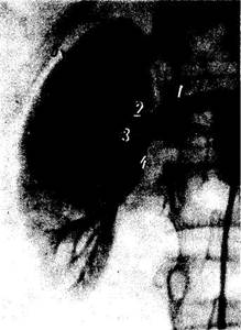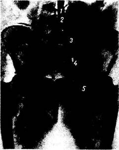Рис. 248. Аортография на живом человеке (по Ю. С. Петросяну). / — аорта; 2 — бифуркация аорты; 3 — общая подвздошная артерия; 4 — наружная подвздошная артерия; 5 — бедренная артерия. Рис. 249. Артериография почки на живом человеке (по У. М. Ризаеву). / - почечная артерия; 2 - верхняя полярная артерия; 3 — срединная артерия; 4 — нижняя полярная артерия; 5 - междолевые артерии. С помощью инъекции контрастного вещества в брюшную часть аорты (аортография; рис. 248) получается изображение брюшной части аорты, pars abdominalis aortae. Видны также бифуркация ее и ход обеих общих подвздошных артерий и их крупных ветвей. На живом вследствие прижизненного тонуса и подвижности соседних органов брюшная часть аорты может несколько смещаться вправо и идти слегка дугообразно выпуклостью вправо, что может ошибочно быть принято за патологию, например оттеснение аорты опухолью. Рентгенологическое исследование остальных кровеносных сосудов живого человека путем введения (инъекции) непосредственно в сосуды контрастных веществ с одновременной в момент инъекции рентгенографией называется вазографией. При инъекции в сонную артерию исследуют общую сонную артерию, деление ее на наружную и внутреннюю сонные артерии и разветвление их в области головы и головного мозга (артериальная энцефалография, или ангиография мозга). Вводя контрастные вещества в плечевую или бедренную артерию получают изображение крупных магистральных артериальных стволов конечностей и их ветвей. Селективная (избирательная) артериография артерий брюшной полости позволяет изучать чревный ствол, брыжеечные, почечные артерии и их ветви. При этом ясно заметно вхождение артерий в ворота органов, в частности селезенки, печени и почек (рис. 249). При рентгенографии артерий паренхиматозных органов видны не только экстраорганные сосуды, но и интраорганные.