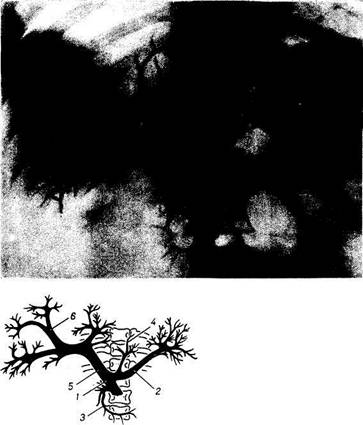 Рис. 250. Артериоэнцефалография на живом человеке. Стрелками показаны скопления контрастного вещества в сосудах нижней поверхности головного мозга. 1 — внутренняя сонная артерия на шее; 2 — внутренняя сонная артерия в сонном канале; 3 — передняя мозговая артерия; 4 — средняя мозговая артерия. Рис. 251. Томография легкого на живом человеке (видны разветвления легочной артерии). Благодаря одновременному рентгеновскому изображению костей на рентгенограммах любой области тела легко определяется скелетотопия артерий (рис. 250). С помощью послойного рентгенологического исследования (томография) грудной клетки без введения какого-либо контрастного вещества на светлом поле легкого хорошо выявляется легочный ствол с разветвлениями (рис. 251). Изучению на живом доступна и венозная система, исследуемая с помощью инъекции рентгеноконтрастного вещества и последующей рентгенографии — флебография. Этот метод позволяет получить изображение большинства вен, крупных (полые вены, присердечные и магистральные) и более мелких. Удается получить рентгеновское изображение вен конечностей и внутри-органных вен. Путем введения рентгеноконтрастного вещества через пупочную вену можно получить изображение воротной вены и ее ветвей внутри печени (портография; рис. 252). При этом на рентгенограмме выявляются тончайшие вены, вследствие чего такая рентгенограмма венозных разветвлений на живом не уступает коррозионному препарату печени. Новейший метод рентгеновского исследования — электрорентгенография — выявляет на живом тончайшие разветвления кровеносных сосудов паренхиматозных органов, например легких, благодаря чему рентгеновская картина интраорганных сосудов на живом не уступает таковой, полученной анатомическими способами (инъекция, коррозия, просветление).