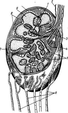 1 — трабекулы; 2 — выносящие лимфатические сосуды; 3 — ворота узла; 4 — анастомоз между приносящими и выносящими сосудами; 5 - мозговое вещество; б — приносящие лимфатические сосуды; 7 — капсула узла; 8 — reticulum; 9 — корковое вещество; 10 — краевой синус. под капсулой узла (sinus marginalis), в который открываются приносящие лимфатические сосуды. Далее она проникает в синусы коркового и мозгового вещества, а затем в воротный синус (sinus hilaris) и из него в выносящие лимфатические сосуды. На своем пути лимфа как бы просачивается также через паренхиму узла и течет по краевому синусу более коротким путем от приносящих лимфатических сосудов к выносящим. Сквозь стенки синусод; в паренхиму лимфатического узла/ проникают и там накапливаются инородные частицы, подвергающиеся ^воздействию лимфы. Каждый лимфатический узел обильно кровоснабжается, причем артерии проникают в него не только через ворота, но и через капсулу. Экспериментально доказан обмен в лимфатических узлах между кровью и лимфой (Ю. И. Бородин и сотр.). Условно выделяют 3 типа лимфатических узлов *. Первый тип характеризуется, в частности, тем, что у него площадь коркового вещества несколько меньше площади мозгового. Лимфатические узлы первого типа быстро и интенсивно наполняются рентгеноконтрастной массой. Лимфатические узлы второго типа компактные. Они характеризуются преобладанием массы коркового вещества над мозговым и рентгенологически медленным и слабым контрастированием. Транспортная функция таких узлов минимальна. Чаще всего встречаются лимфатические узлы третьего типа — промежуточные. Масса коркового и мозгового вещества в них примерно одинакова. Рентгеноконтрастным веществом они заполняются хорошо. Их конструкция эффективно обеспечивает обработку лимфы и транспортную функцию. Отмеченные вариации лимфатических узлов, индивидуальные особенности их конструкции и соответственно функциональные потенции в известной мере обусловливают различную выживаемость онкологических больных. Лимфатические узлы перестраиваются в течение всей жизни, в том числе у пожилых и старых людей. От юношеского возраста (17 — 21 год) до пожилого (60 — 75 лет) количество их уменьшается в 1 г/г—2 раза. По мере увеличения возраста человека в узлах, преимущественно соматических,