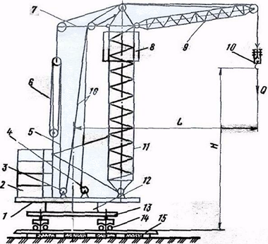 1 - поворотна платформа; 2 - противага; 3,4 - стрілова і; і вантажна лебідки; 5,6 - відповідно стріловий канат і поліспаст, 7 - консоль; 8 - кабіна керування, 9 - стріла; 10 - гакова підвіска; 11 - башта; 12 - опорно-поворотний пристрій та механізм повороту, 13 - рама ходового пристрою; 14 - ходовий візок; 15 - крановий шиях, 16 - вантажний канат