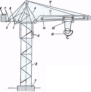 Рис. 6.2 – Схема баштового крана з неповоротною баштою: 1 – фундамент; 2 – башта; 3 – кабіна керування; 4 – механізм повороту; 5 – консоль; 6 – поротивовага; 7,8 – вантажно і стрілова лебідки; 9 – наголовник; 10 – стріла; 11 – вантажний канат; 12 – гакова підвіска; 13 – візок вантажний; 14 – лебідка переміщення візка.