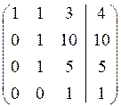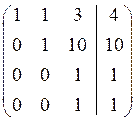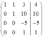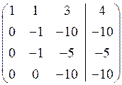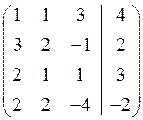 Розв’язання. Складемо розширену матрицю системи і будемо робити над нею необхідні елементарні перетворення, щоб одержати трикутну матрицю. На початку переставимо перше і третє рівняння місцями, а потім помножимо елементи першого рядка відповідно на мінус три, мінус два та мінус два і одержані результати додамо відповідно до елементів другого, третього та четвертого рядків. Аналогічно вчинимо з елементами другого, а потім третього рядків. Одержимо матрицю