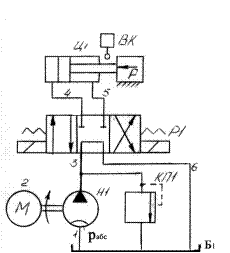 Для контролю тиску олії служить манометр 9 із краном 11. Дросель зі зворотним клапаном 10 встановлений для забезпечення плавного затиску трубки. Розтиск затискачів відбувається при переключенні повітророзподільника і подачі стиснутого повітря в штокову порожнину циліндра 4. Схема гідроприводу з безупинним керуванням робочого органа, без зворотного зв'язку, показана на рисунку 1.5. Ця схема ГПА забезпечує не тільки цикл РХ-БП-РХ-БО, але і забезпечує безупинну зміна швидкості гідроциліндра при робочому ході (РХ). При РХ частина рідини від насоса надходить у гідроциліндр (через дросель), інша частина зливається через переливний клапан у маслобак. БП - здійснюється через розподільник Р1 (при його відкритті); швидкий відвід БО також здійснюється через нього. На функціональних і структурних схемах гідропривід зображують квадратом з літерою