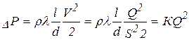Виразимо перепад тисків у трубопроводі через витрату рідини: