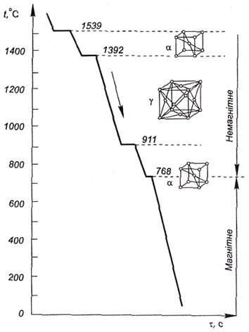 Зміна типу кристалічної будо- Рис. 1.3. Крива охолодження заліза ви у твердому стані відбувається шляхом зародження центрів нових кристалів і подальшого їх росту. Такий процес іноді називають вторинною кристалізацією на відміну від кристалізації первинної, що відбувається у рідині. Під час вторинної кристалізації зародки нових кристалів найчастіше виникають на границях зерен старих кристалів.