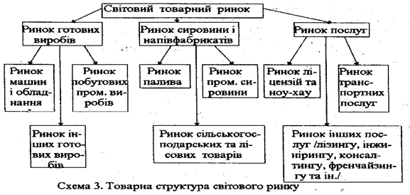 За товарно-галузевою структурою світового ринку відрізняють окремі товарні ринки, які відповідають рівню ринку певного товару або його частини. За основу цієї класифікації беруть Міжнародну класифікацію 00Н - Стандартну Міжнародну торговельну класифікацію - СМТК, Брюссельську митну номенклатуру, Гармонізовану систему опису товарів. За товарно-галузевою структурою світового ринку відрізняють три провідних групи товарів - готові вироби, сировину і напівфабрикати, послуги (схема 3).