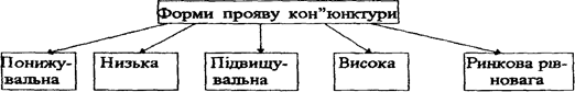 Схема 7. Форми прояву кон’юнктури В умовах понижувальної кон’юнктури спостерігається стабільна перевага пропозиції товару над попитом, падіння цін на товар, скорочення числа укладених угод. Таке становище на ринку називають "ринком покупця". Низька кон’юнктура відбиває панівну перевагу пропозиції товару над його попитом до позиції їх урівноваження, коли число торговельних операцій та ринкові ціни досягають свого мінімального значення, понижуються прибутки фірм. Кон’юнктура підвищувальна - це стабільна перевага попиту над пропозицією товару, зростання ринкових цін на товар та числа торговельних угод ("ринок продавця").