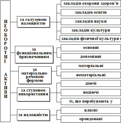 · Необоротні активи являють собою сукупність матеріально-речових і нематеріальних цінностей та об’єктів, які належать установі, забезпечуючи її функціонування, і мають очікуваний термін корисної дії чи експлуатації понад один рік. · До складу необоротних активів належать земельні ділянки, капітальні витрати на поліпшення земель, будинки, споруди, частини будинків, які на правах власності належать установі, передавальні пристрої, робочі, силові машини й обладнання, транспортні засоби, інструменти, прилади, столовий, кухонний та господарський інвентар, обчислювальна техніка, робоча та продуктивна худоба, багаторічні насадження, музейні цінності, експонати зоопарків, виставок, бібліотечні фонди, знаряддя риболовлі, спеціальні інструменти та спеціальні пристосування, білизна, постільні речі, одяг та взуття, тимчасові нетитульні споруди, природні ресурси, інвентарна тара, матеріали довготривалого використання для наукових цілей, авторські та суміжні з ними права, права користування природними ресурсами, майном, об’єктами промислової власності, інші матеріальні та нематеріальні активи довготривалого використання. · Склад необоротних активів доволі різноманітний, а тому вони потребують класифікації. Згідно з наявною практикою необоротні активи можна класифікувати за такими ознаками: · галузевою належністю; · функціональним призначенням; · матеріально-речовою формою; · ступенем використання; · належністю. · · Класифікація необоротних активів