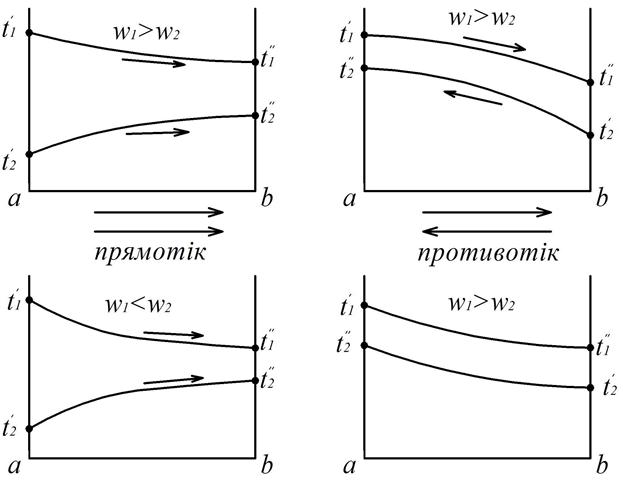 Позначення із виразу (5.2), що мають індекс 2, характеризують ті ж величини, але відносяться до холодного теплоносія. На характер зміни температури робочих рідин вздовж поверхні теплообміну впливає схема їх руху і співвідношення їх водяних еквівалентів. Відрізняють наступні схеми руху потоків: