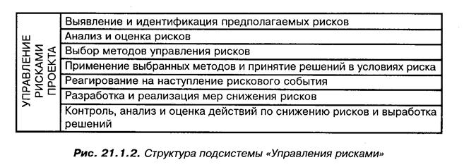 Управление проектами подразумевает не только констатацию факта наличия неопределенности и рисков и анализ рисков и ущерба. Рисками проектов можно и нужно управлять. Управление рисками — совокупность методов анализа и нейтрализации факторов рисков, объединенных в систему планирования, мониторинга и корректирующих воздействий [3, 10—12]. Управление рисками является подсистемой управления проектом, структура подсистемы представлена на рис. 21.1.2, методы управления рисками на рис. 21.1.3.