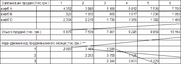 Касовий бюджет повинен включать всі грошові надходження і виплати, які доцільно згрупувати по видам діяльності: операційна, інвестиційна і фінансова. Таб.7.3 Прогноз надходження грошових коштів від продажів