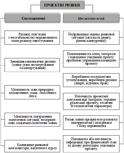 Існує два види ризику, пов’язаного з підготовкою і реалізацією проекту: систематичний і несистематичний (рис.1). Систематичний ризик належить до зовнішніх щодо проекту чинників, приміром, стан економіки в цілому, і перебуває поза загальним контролем над виконанням проекту. Прикладами систематичного ризику є також політична нестабільність, умови оподаткування, тобто чинники, пов’язані з діями держави. Інші види систематичного ризику відбивають вплив чинників конкурентного середовища, як-от загальний ринковий попит, рівень конкуренції, ціни на сировину і робочу силу в галузі. Означені чинники мають розглядатися, бо проект замалий для того, щоб впливати на зміну цих чинників. Несистематичним є ризик, що безпосередньо стосується проекту. Рівень рентабельності виробництва, період початку будівництва і сам процес будівництва, вартість основного капіталу і продуктивність — усе це є видами несистематичного ризику. Інші види несистематичного ризику включають у себе зовнішні чинники, які можна контролювати або впливати на них у межах проекту. Це — заробітна плата персоналу проекту, ціни збуту продукції проекту, ціни постачальників на сировину і навіть урядові податки, як-от митний та акцизний збори, інші види податків. Сучасна практика виокремлює ще декілька класифікаційних ознак проектних ризиків. За тривалістю дії ризики можуть бути короткостроковими, тобто пов’язаними з фінансовими інвестиціями, що впливають на ліквідні позиції фірми, або довгостроковими, які виникають під час вибору напрямку інвестування. За мірою впливу на фінансовий стан фірми розрізняють ризики допустимі (пов’язані із загрозою певної втрати прибутку), критичні (пов’язані із можливою втратою очікуваної виручки) і катастрофічні (що виникають у разі втрати усього капіталу фірми і супроводжуються банкрутством). За можливістю усунення ризики поділяють на недиверсифіковані (що не підлягають усуненню) і диверсифіковані (для яких існують можливі шляхи подолання). За мірою впливу на зміну реальних активів фірми можна виділити: динамічні — ризики непередбачених змін вартості основного капіталу, що відбуваються внаслідок прийняття відповідних управлінських рішень, ринкових або політичних обставин, які можуть призвести як до втрат, так і до збільшення прибутків; статичні — ризики втрати реальних активів унаслідок завдання збитків власності через некомпетентність керівництва.