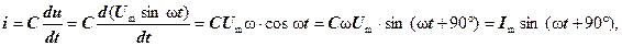 Останній вираз є виразом закону Ома для кола з ємністю. В аргументі синусу (+90°) свідчить, що в колі з ємністю струм випереджає за фазою напругу на 90°.