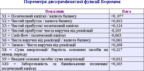 Одержані значення інтегрального показника Беерман рекомендує інтерпретувати наступним чином (горизонт прогнозування 1 рік): Z > 0,32 - підприємство знаходиться під загрозою банкрутства; 0,32 > Z > 0,236 - неможливо чітко ідентифікувати, потребує додаткового якісного аналізу Z < 0,236 - підприємству не загрожує банкрутство. Використання методології багатофакторного дискримінантного аналізу у вітчизняній практиці є досить обмеженим, що зумовлено такими основними чинниками: В той же час, в Україні використовуються численні методики однофакторного дискримінантного аналізу, однак ці методики є безсистемними, не враховують галузевих особливостей, не містять відповідних "ключів" інтерпретації.