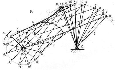 Таким чином, масштаб довжини – це відношення натурального розміру ланки в метрах до довжини відрізка в міліметрах, який зображує цю ланку на кресленні (плані механізму), При виборі масштабу рекомендують дотримуватися стандартних креслярських масштабів, а також міркувань зручності підрахунків та наочності зображення. Наприклад, масштабу М1:1 відповідає масштабний коефіцієнт μl = 0,001м/мм, масштабу М1:2 відповідає μl=0,002м/мм і т.ін. Для побудови планів механізму повинні бути задані розміри всіх його ланок, а якщо будується одне конкретне положення механізму і положення початкової ланки. У русі більшості механізмів спостерігається періодичність, при цьому усі кінематичні параметри механізмів змінюються періодично. Тому, зазвичай, при дослідженні механізмів будують ряд послідовних положень механізму. При виконанні курсових проектів, як правило, кінематична схема механізму будується для 12 положень. Послідовність побудови планів механізму: - вибирають масштаб побудови - знаходять довжини відрізків, якими на кресленні зображатимуться ланки (рис. 2.1 - - перш за все, на креслення наносять положення нерухомої ланки (намічаються нерухомі точки механізму, наносяться, при наявності, нерухомі напрямні; на рис. 2.1 - т. О1, С); - викреслюють задане положення початкової ланки. Якщо будується n планів механізму, то знаходять початкові (“мертві”, крайні) положення механізму і, відповідно, початкової ланки; - лише після цього викреслюють групи Ассура в порядку їх приєднання при утворенні механізму. Наголосимо, що доцільно за початкове положення механізму (кривошипа) вибрати те, яке відповідає одному з крайніх положень вихідної ланки (ланки, до якої прикладена сила корисного опору, або рушійна сила). У кривошипно-повзунному механізмі чи шарнірному чотириланковику (або якщо вони лежать в основі розглядуваних механізмів) вихідна ланка перебуватиме у крайніх положеннях, коли кривошип накладатиметься на шатун, або витягуватиметься в одну лінію з ним. У кулісному механізмі вихідна ланка (куліса СД, рис. 1.3, в) перебуватиме у крайніх положеннях, коли кривошип АВ і куліса утворять прямий кут. Зазначимо, що з двох крайніх положень механізму за початкове вибирають те, що відповідає початку робочого ходу. Оскільки в більшості машин робочий хід здійснюється повільніше (рівномірніше) ніж холостий, то він відповідає руху кривошипа з одного крайнього положення до іншого через більший з центральних кутів. Більший з центральних кутів, що описує кривошип при русі механізму з одного крайнього положення до другого, називається кутом обочого ходу. Розглянемо побудову 12 планів механізму на прикладі шарнірного чотириланковика, структурна схема якого зображена на рис. 1.3, а. Виконуємо перші три пункти наведеної вище послідовності побудови планів. Після цього, радіусом О1А (рис. 2.1) проводимо коло з центром у т. О1, яке є геометричним місцем миттєвих положень т. А кривошипа 1. Як відомо, закон руху початкової ланки в загальному випадку задається у вигляді рівняння Для визначення положення ланок 2 і 3 достатньо встановити положення кінематичної пари В, що шарнірно з’єднує ці ланки між собою. Для цього роз’єднуємо шарнір у т. В і розглядаємо можливі рухи цієї точки. Оскільки нерухомий центр обертання С займає цілком певне положення, то т. В, яка знаходиться на сталій відстані В