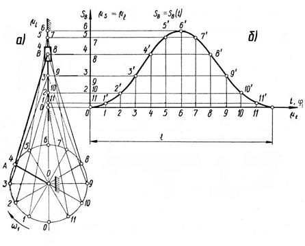 Рис. 2.2 При побудові планів механізмів, що мають триповодкові групи, також може бути використаний метод перетину двох траєкторій відносного руху (спосіб засічок). Цей спосіб в розглядуваному випадку ще називають способом удаваних положень або геометричних місць. Оскільки даний метод побудови є досить трудомістким, часто користуються шаблоном, який має форму базисної ланки. У випадку механізмів з вищими кінематичними парами (наприклад, кулачковими) доводиться враховувати, що профілі, або один з них, мають складні контури. Викреслювання послідовно декількох складних профілів є трудомісткою процедурою. У цих випадках доцільно застосувати метод обернення руху (метод інверсії). Суть його полягає в тому, що всьому механізмові (разом зі стояком) надають обертання з кутовою швидкістю, яка дорівнює за величиною, але протилежна за напрямом кутовій швидкості ланки, що має складний профіль (кулачок). Таким чином, рухому ланку зі складним контуром умовно роблять нерухомою; це дозволяє викреслювати її лише один раз. Відносне положення усіх ланок при цьому не змінюється. Приклад використання методу обернення руху буде розглянуто при вивченні кулачкових механізмів. При побудованих планах механізму неважко побудувати діаграми переміщення та отримати функції положень ланок механізму. Побудова діаграм переміщення. При дослідженні механізмів будують діаграми лінійних або, при коливальному русі ланки, кутових переміщень. Розглянемо побудову графіка sB(t) переміщень повзуна В кривошипно-повзунного механізму (рис. 2.3): - викреслюють 12 рівновіддалених за кутом повороту кривошипа планів механізму в масштабі - будують прямокутну систему координат. На осі абсцис відкладають відрізок l, що в масштабі - ділять відрізок l на 12 рівних частин. Від точок поділу 1, 2, 3, …11, паралельно осі ординат, відкладають відрізки 1-1/, 2-2/, 3-3/,..., які у вибраному масштабі З’єднавши одержані точки 0, 1/, 2/,…11/ плавною кривою, отримують діаграму переміщень повзуна, sB(t). Оскільки у задачах кінематики прийнято рух кривошипа рівномірним (за однакові проміжки часу він повертається на рівні кути), то можна вважати, що по осі абсцис відкладено і час t і кут повороту кривошипа