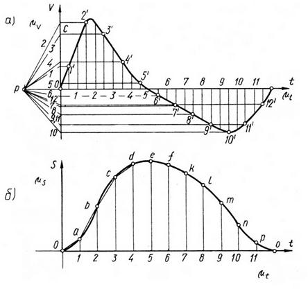 Рис. 2.7 2. Проводимо полюсну відстань ОР. Ординат 1/, 2/, 3,/ …середини кожного інтервалу проектують на вісь ординат і отримані точки з’єднують з полюсом Р. 3. Під діаграмою швидкості будуємо нову систему координат (рис. 2.7, б). Ділимо вісь абсцис на такі ж інтервали, як і на попередньому графіку. 4. З початку нової системи координат 0 проводять у першому інтервалі лінію 0а паралельно до променя Р1; з кінця відрізка 0а проводять у другому інтервалі відрізок ав паралельний променю Р2, і так далі, bc//Р3, сd//Р4,... Отриману ламану лінію замінюють плавною кривою, одержують графік переміщень Масштаб одержаної інтегральної кривої знаходять за формулою