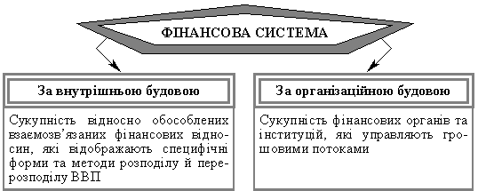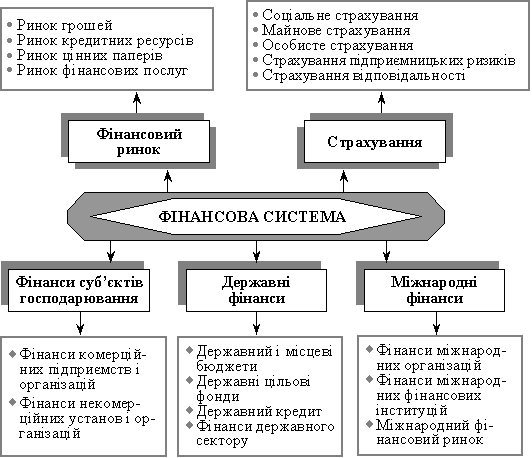 1. За внутрішньою будовою фінансова система являє собою сукупність відносно відособлених взаємозв’язаних сфер і ланок фінансових відносин, які відображають специфічні форми й методи розподілу і перерозподілу валового внутрішнього продукту. Фінансові системи держав можуть відрізнятися за своєю структурою, оскільки вони є відображенням існуючої моделі економіки, але у всіх у них є загальна ознака — це різноманітні фонди фінансових ресурсів, які різняться методами мобілізації і напрямами використання. Нині у світі налічується понад 20 різних моделей фінансових систем окремих держав. Структура фінансової системи динамічна. У державах із перехідною економікою фінансові системи характеризуються тим, що окремі їхні ланки перебувають на стадії формування. Це насамперед фінансовий ринок, страхові фонди і страховий ринок, державний кредит, місцеві фінанси. Базовою ланкою фінансової системи є фінанси підприємницьких структур, до якої належать фінанси як виробничої, так і невиробничої сфер. Вони обслуговують створення валового внутрішнього продукту — основного джерела фінансових ресурсів. Нині підприємницькі структури володіють 25—30 % всіх фінансових ресурсів держави. Фінанси виробничої сфери залежно від форми власності поділяються на державні, акціонерні, колективні, індивідуальні, орендні, спільні тощо, а залежно від виду діяльності суб’єкта господарювання — на фінанси машинобудування, будівництва, сільського господарства, транспорту тощо. Фінанси соціальної сфери, яка поділяється на фінанси освіти, охорони здоров’я, культури, оборони й інших підрозділів, характеризуються особливостями створення й використання фондів та фінансових ресурсів, зокрема наявністю поряд із власними джерелами бюджетного фінансування. Провідне місце належить підприємствам державної форми власності, хоча із розвитком ринкових відносин питома вага підприємств недержавної форми власності зростатиме. У процесі своєї діяльності підприємства вступають у взаємовідносини з іншими суб’єктами господарювання, з фізичними особами, з різними ланками фінансової системи. Фінанси підприємницьких структур пов’язані з розподільними і перерозподільними відносинами, які можна об’єднати у три групи: внутрішні, внутрішньокорпоративні й зовнішні. Державні фінанси охоплюють: державний та місцеві бюджети; державні фонди цільового призначення; державний кредит; фінанси підприємств і організацій державної форми власності. У сфері державних фінансів грошові потоки відображають відносини перерозподілу ВВП. Провідне місце у державних фінансах належить бюджетам різних рівнів, які об’єднуються в Україні у зведеному бюджеті держави. Із бюджету фінансуються операційні та інші витрати на розвиток агропромислового комплексу, надаються дотації вугільній промисловості, спрямовуються капіталовкладення в об’єкти загальнодержавного значення, фінансуються науково-технічні програми. Державні фонди цільового призначення концентрують у своєму розпорядженні майже чверть усіх фінансових ресурсів держави. До них належать: Пенсійний фонд та інші соціальні фонди. 2. Фінансовий ринок як сфера фінансової системи включає ринок грошей, кредитних ресурсів, цінних паперів і фінансових послуг. Ринок грошей, або валютний ринок — це створення фондів фінансових 