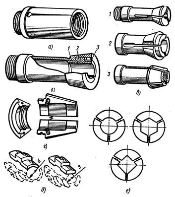 Рис. 4.19 Основні типи цанг для токарних верстатів: а — подавальна цанга, б – затискна цанга зі змінними вкладишами, в — затискні цільні цанги, г — затискна рознімна цанга, д — форми отворів подавальних і затискних цанг, е — змінні вкладиші цанг Подавальна цанга (рис. 4.19 а) являє собою сталеву загартовану втулку, що має три повні розрізи, що утворюють пружинисті пелюстки, кінці яких підігнуті один до одного. Форма й розміри отвору подавальної цанги повинні відповідати профілю прутка. Цанга нагвинчується на подавальну трубу, яка отримує осьове переміщення від кулачкового механізму або від гідромеханічного привода для подачі розташованого в ній прутка. При завантаженні верстата пруток проштовхують між пелюстками подавальної цанги. При цьому пелюстки цанги притискаються до поверхні прутка силою пружності. Затискна цанга може бути виконана у вигляді втулки з 3 — 6 пружинистими пелюстками (рис. 4.19, в). Цангу із трьома пелюстками застосовують при обробці заготовок від 0 до 3 мм, із чотирма— до 80 мм та з шістьома — понад 80 мм. Кут при вершині конуса цанги дорівнює 30°. На рис. 4.19, б показана затискна цанга зі змінними вкладишами. Перед обробкою прутка іншого перерізу послабляють гвинти 8, установлюють вкладиші 1 потрібного профілю та розміру, орієнтуючи їх по штифтах 2. Для обробки заготовок малого діаметра застосовують затискні рознімні цанги (рис. 4.19) у яких розведення кулачків забезпечується пружинами. У деяких випадках застосовують рознімні цанги зі змінними вкладишами (рис. 4.19 е) форма (рис. 4.19 д) і розміри яких залежать від оброблюваного прутка.