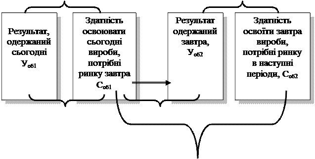 З огляду на складність виробничих відносин підприємства і різноманіття виконуваних ним функцій, варто думати, що гнучкість підприємства визначається значною кількістю внутрішніх і зовнішніх факторів, кожний з яких впливає на його здатність до відновлення продукції. Існує два основних критерії для розкриття гнучкості підприємства: · для оцінки результатів діяльності підприємства в даному періоді, тобто для одержання техніко-економічних показників (результат для відновлення); · для визначення взаємозв’язку підприємства із зовнішнім середовищем, тобто здатності підприємства планувати і прогнозувати процес свого розвитку для відновлення (здатність до відновлення). Гнучкий розвиток підприємства можна зобразити схематично (рис.7.1): цикл 1 цикл 2