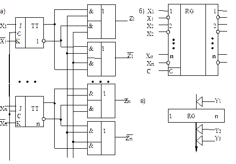 Регистр - это типовой узел ЭВМ, который служит для запоминания и преобразования многоразрядных двоичных слов. Регистр состоит из триггеров и вспомогательных логических схем. В регистрах выполняется ряд микроопераций. К ним относятся: установка разрядов регистра в нулевое или единичное состояние; прием слова из другого устройства; выдача слов из регистра в прямом или обратном кодах; сдвиг слов в разрядной сетке влево или вправо; преобразование последовательного кода слова в параллельный и обратно. Регистры строятся на D, RS, JK-триггерах. По способам приема и выдачи данных регистры делятся на параллельные, последовательные (сдвигающие) и последовательно-параллельные. В параллельных регистрах прием и выдача слов производится параллельно по всем разрядам. В последовательных регистрах прием и выдача разрядов слов осуществляется поразрядно. Такие регистры также называют сдвигающими. В реверсивных регистрах сдвиги осуществляются и вправо, и влево. В последовательно-параллельных регистрах имеются входы для параллельного и последовательного приема (выдачи) слов, что позволяет осуществлять преобразование последовательных кодов в параллельные и наоборот. По количеству каналов, по которым передается одна двоичная единица, различают парафазные и однофазные регистры. В первом случае двоичные единицы передаются по двум цепям каждая, т.е. каждый разряд передается в виде прямого значения переменной Xi и ее инверсии Xi, а в однофазных - только по одной цепи (Xi или Xi). На рис. 4.6 а показан n -разрядный параллельный регистр с парафазным приемом и передачей информации. Прием парафазных кодов чисел X осуществ-ляется с помощью управляющего сигнала у1. Микрооперации выдачи кода из регистра производятся с помощью сигналов y2 и у3. Сигнал yg выдает содержимое в прямом коде,а у3 в обратном. Условные обозначения n-разрядного регистра на функциональных и структурных схемах приведены соответственно на рис. 4.6 б и 4.6 в.