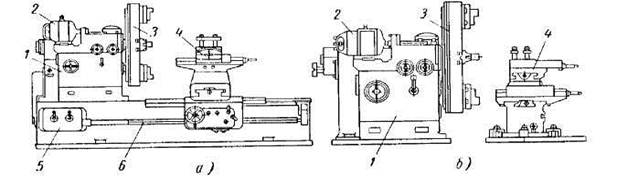 Лобовые и карусельные станкиЛобовые станки. Для обработки коротких заготовок большого диаметра и небольшой длины типа шкивов, больших зубчатых колес, маховиков в индивидуальном производстве и в ремонтных мастерских применяют токарные лобовые станки.По внешнему виду они отличаются от токарных станков сравнительно малой длиной и большим (до 4 м) диаметром планшайбы, а также отсутствием задней бабки. На рис. 3.5 приведены лобовые станки с суппортом, установленным на одной станине со шпиндельной бабкой (рис. 3.5, а) и с обособленным суппортом (рис 3.5, б). Станки состоят из следующих основных узлов: передней бабки 1 с коробкой скоростей и главным электродвигателем 2, планшайбы 3, суппорта 4. Станок с общей станиной имеет коробку подач 5, передающую движение на ходовой вал 6. Станки с обособленным суппортом предназначены для обработки особо крупных деталей, превышающих диаметр планшайбы. Для этого в фундаменте под планшайбой делают