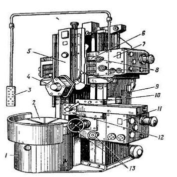Рис. 3.12. Двухстоечный токарно-карусельный станок мод. 1525 Двухстоечные токарно-карусельные станки выпускаются мод. 1520, 1Л525 1525, 1Л532, имеющих унифицированные узлы и отличающихся в основном своими габаритными размерами, массой и размерами обрабатываемых деталей. Общий1 вид токарно-карусельного станка мод. 1525 показан на рис. 3.12. Станок имеет следующие основные узлы: стол 1, планшайбу 2, стойки 5 и 11, скрепленные между собой балкой 10. По вертикальным направляющим стоек с помощью вертикальных ходовых винтов 6 и 12 от отдельного электродвигателя может перемещаться траверса 8. По горизонтальным направляющим могут перемешаться два вертикальных револьверных суппорта 7 и 9. Суппорты приводятся в движение двумя одинаковыми коробками подач 4 и 13. В обычном исполнении станок не имеет бокового суппорта. С подвесной кнопочной станции 3 производят дистанционно управление станком. Маховичками 14 осуществляют ручное перемещение суппортов. Коробки скоростей и подач оснащены электромагнитными муфтами, которые облегчают управление станком и работу суппортов станка по упорам. По особому заказу для станка могут быть поставлены боковой cynnopт с коробкой подач; правый вертикальный неповоротный суппорт; приспособление для обработки фасонных поверхностей; приспособлении для нарезания резьб; приспособление для